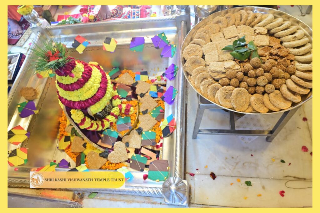 आज 15 जनवरी 2026 को मकर संक्रांति के पावन अवसर पर बाबा विश्वनाथ की विशेष मध्याह्न भोग आरती संपन्न हुई। इस शुभ अवसर पर परंपरागत और सात्त्विक अन्न से बाबा का भोग अर्पित किया गया। मध्याह्न भोग आरती में बाबा विश्वनाथ को खिचड़ी, चिवड़ा, मूंगफली की पट्टी, पापड़ तथा अचार का भोग लगाया गया। भोग अर्पण के पश्चात विधि-विधान से आरती की गई, जिसमें श्रद्धा और आस्था का भाव स्पष्ट रूप से दिखाई दिया।