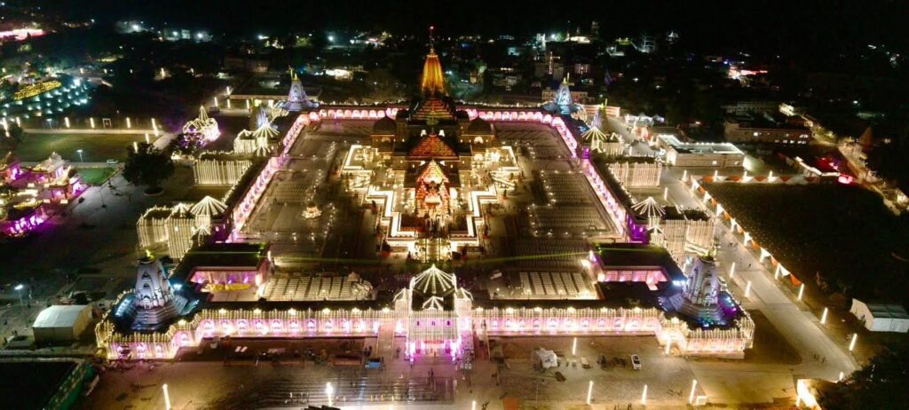 ध्वजारोहण उत्सव की पूर्व संध्या पर प्रकाश से आलोकित श्री राम जन्मभूमि मंदिर